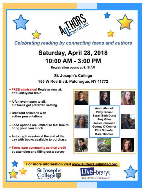 One of my favorite book events is tomorrow! Authors Unlimited in Patchogue, NY, on Sat April 28, 10am-3pm. It's 8 authors, 1 panel with all of us, then breakout sessions. Loved it the last time I was there, and I'm really excited to go back!