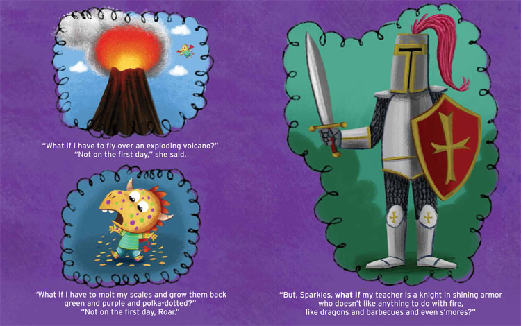 Big sister Sparkles reassures Roar that school is fun! And when the first day arrives, Roar finds his worries melt away. He meets new friends, plays dragon games, listens to fun stories, and finds a way to thank his sister for her support.