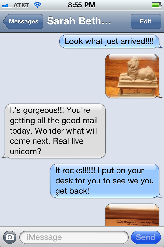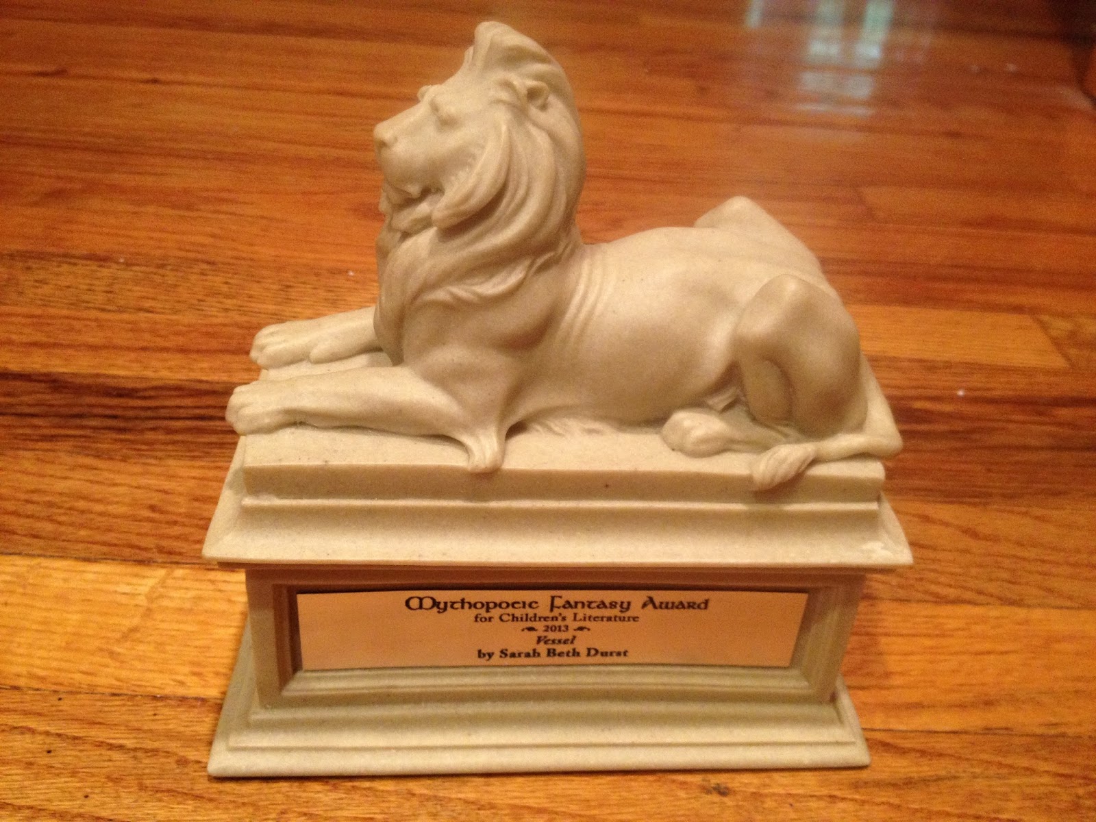Earlier this summer, I was thrilled and honored to learn that Vessel had been awarded the 2013 Mythopoeic Fantasy Award for Children's Literature. And just a few days ago, I received the loveliest thing I've ever gotten in the mail: the gorgeous lion-shaped Mythopoeic Award statuette!!!!!