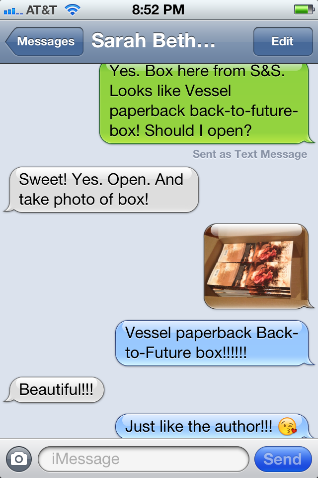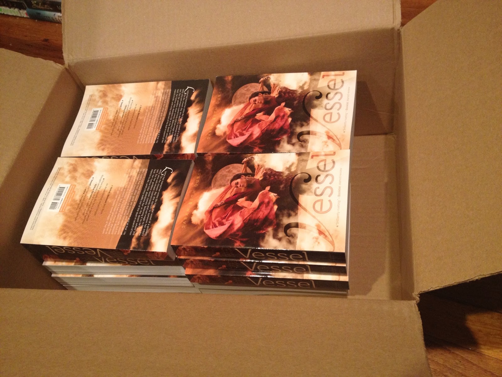 Anyway, over the past week, I've received not one but TWO Back-to-the-Future boxes! Here's the box full of copies of the paperback edition of VESSEL (which comes out on Aug 27th):