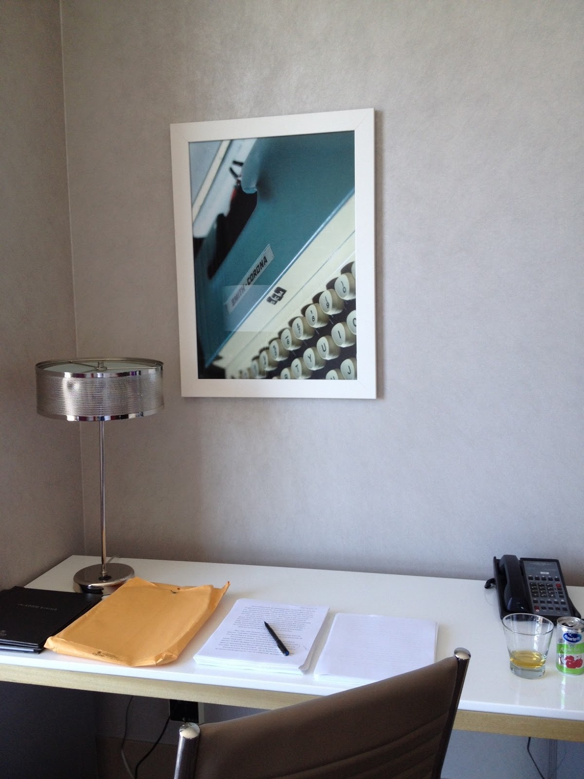 On Saturday, I again woke early (though thankfully not as insanely early as on Friday), and I did some writing. Appropriately, the artwork in the hotel room featured old typewriters. Here's my desk in the hotel room: