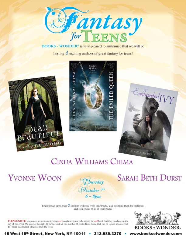 First event is this Thursday at one of my all-time favorite bookstores: Books of Wonder in NYC. I'll be appearing with Cinda Williams Chima (author of The Exiled Queen) and Yvonne Woon (author of Dead Beautiful). Here's the lovely poster: