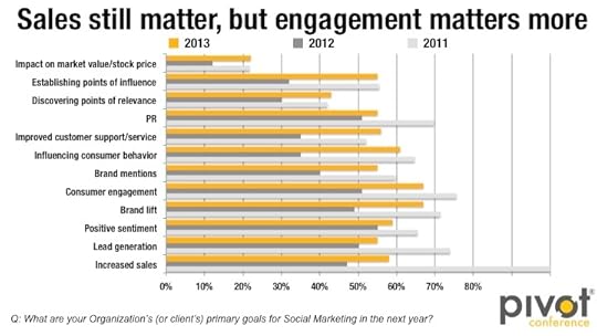 As you can see, primary goals fluctuated over the years, shifting toward a more customer-centric approach. Customer engagement, awareness, influence, satisfaction, and service top 2013 social goals whereas sales was off the charts in 2011.
