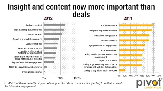 Over the years, social marketers took a publish first ask second approach in social strategies. Assumptions outweighed intelligence. But in 2012, businesses started to realign customer expectations with social media strategies. In 2013 planning, social strategists now believe exclusive content is more important than customer service (2011).
