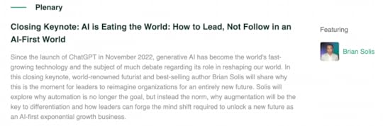 Closing Keynote: AI is Eating the World: How to Lead, Not Follow in an AI-First WorldSince the launch of ChatGPT in November 2022, generative AI has become the world’s fast-growing technology and the subject of much debate regarding its role in reshaping our world. In this closing keynote, world-renowned futurist and best-selling author Brian Solis will share why this is the moment for leaders to reimagine organizations for an entirely new future. Solis will explore why automation is no longer the goal, but instead the norm, why augmentation will be the key to differentiation and how leaders can forge the mind shift required to unlock a new future as an AI-first exponential growth business.