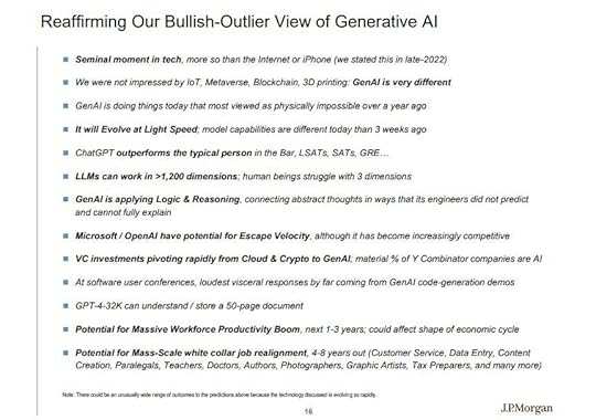 Generative AI will continue to grow, exponentiallyJ.P. Morgan maintains its bullish-outlier view of GenAI. They believe this is a seminal moment in tech.