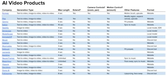 Moore put together a public Google Doc that tracks the 21 AI video companies she’s tracking with links.