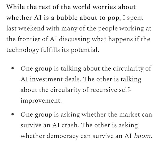 The focus on the economic alarm bells is generally an unproductive distraction, but I get it. The fear of a bubble-pop and its impact on the economy draws a visceral reaction by those still reeling from the last economic disaster. At the same time, waves of AI impact will change how we work and who or what we employ and why. It’s also helpful to listen to people with “situational awareness” of subjects we may not follow, understand, or care to understand.
