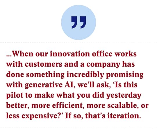 For example, when our innovation office works with customers and a company has done something incredibly promising with generative AI, we’ll ask, “Is this pilot to make what you did yesterday better, more efficient, more scalable, or less expensive?” If so, that’s iteration. Innovation is doing what you didn’t do yesterday to create new value.