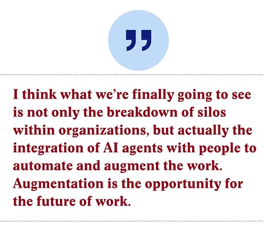 As a practicing futurist, there was a time when I had to look out 10 years, and it’s getting harder, especially how fast we’re moving. I think what we’re finally going to see is not only the breakdown of silos within organizations, but actually the integration of AI agents with people to automate and augment the work. Augmentation is the opportunity for the future of work.