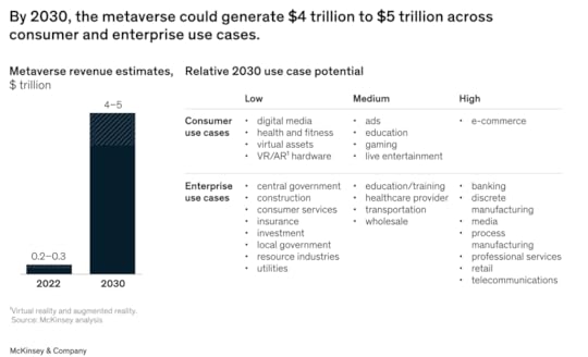 The case for optimismWhen we estimated the market value of metaverse activity in June 2022, we calculated that it was between $200 billion and $300 billion. It’s larger now, and in eight years or so, it could be $4 trillion to $5 trillion (exhibit), which is roughly the size of Japan’s economy, the third largest in the world. Exponential growth is possible because of an alignment of several forces: the metaverse’s appeal spans genders, geographies, and generations; consumers have already shown they are ready to spend on metaverse assets; they are open to adopting new technologies; companies are investing heavily in the required infrastructure; and brands experimenting in the metaverse are finding that customers are delighted.