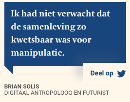 ‘De goede kant van de sociale media is dat het ons inderdaad een stem gaf, maar dat is meteen ook de slechte kant. Het leidde ook tot het zaaien van verdeeldheid. Ik had niet verwacht dat de samenleving zo kwetsbaar was voor manipulatie en desinformatie’, zegt Solis.