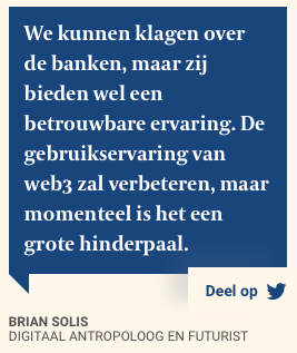 ‘Daarnaast is het heel moeilijk om web3 te beginnen gebruiken’, zegt de futurist. Je moet een digitale portefeuille hebben, cryptomunten zoals bitcoin of ethereum kopen om daar vervolgens een NFT mee aan te schaffen en vervolgens moet die NFT veilig worden opgeslagen. ‘We kunnen klagen over de klassieke banken, maar zij bieden wel een betrouwbare ervaring. De gebruikservaring van web3 zal verbeteren, maar is momenteel een grote hinderpaal.’