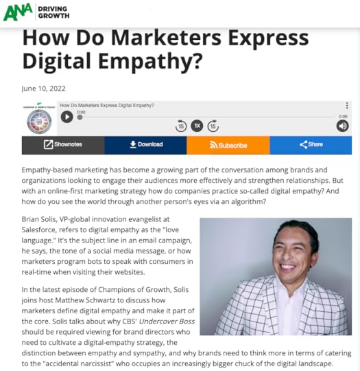 In the latest episode of Champions of Growth, Solis joins host Matthew Schwartz to discuss how marketers define digital empathy and make it part of the core. Solis talks about why CBS’ Undercover Boss should be required viewing for brand directors who need to cultivate a digital-empathy strategy, the distinction between empathy and sympathy, and why brands need to think more in terms of catering to the “accidental narcissist” who occupies an increasingly bigger chuck of the digital landscape.