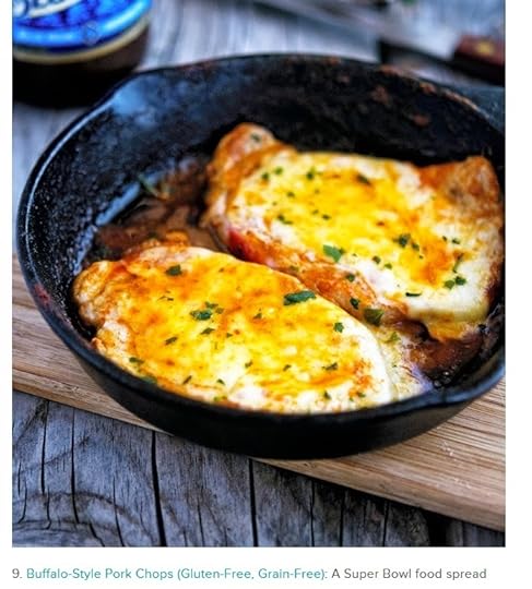 This one jumped out at me. I think I'll save the recipe for later though.Buffalo-style Pork Chops Covered in Cheese. Yummmmm!