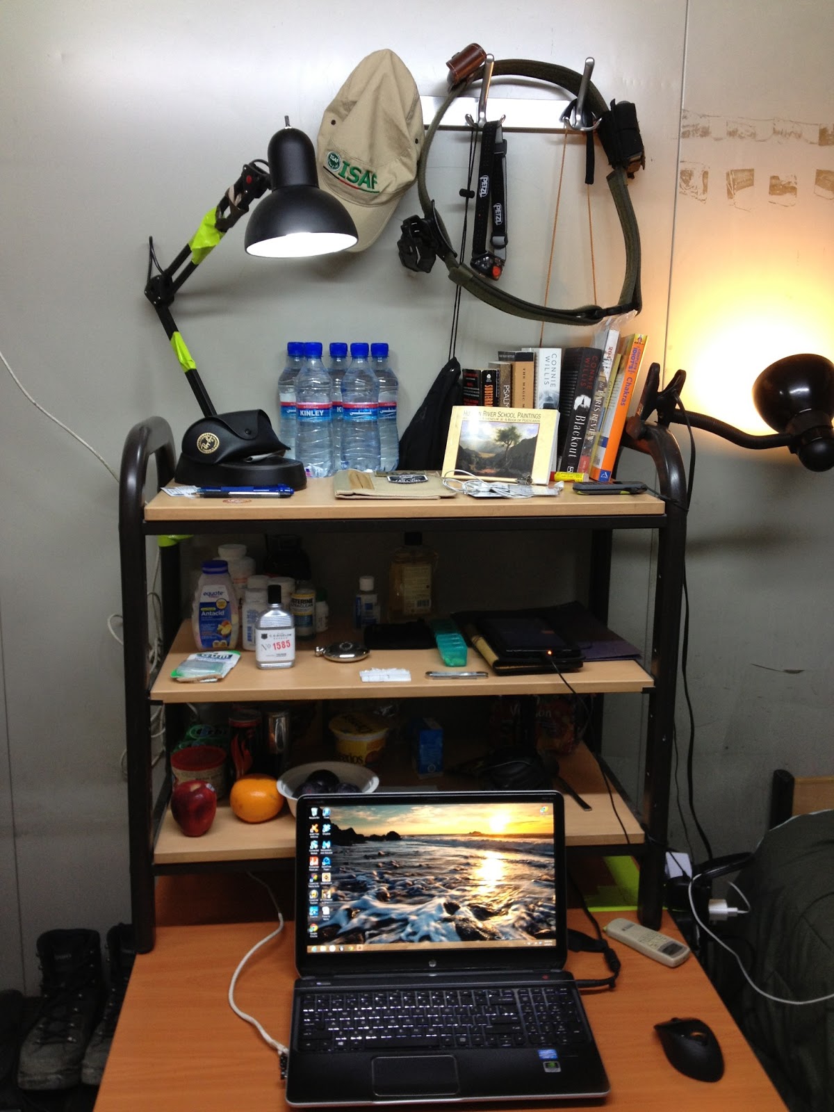 Afghanistan has none of that. I live in a fifteen by fifteen square foot space, with a wall locker, a bed, and a desk setup-- and I feel lucky to have it. Some folks are stacked three and four to a room like mine. Housing is in a shortage, so to have enough space to call my own is a luxury.