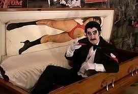 (Check out that coffin. Is that Vampirella on the roof? No wonder he likes to sleep in one of those.)