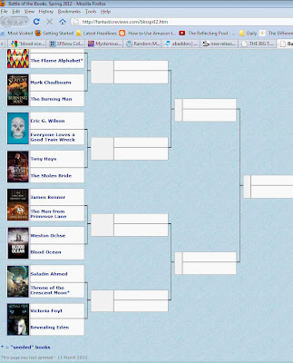 For the first round, the Fantastic Reviews judge (usually me, Aaron Hughes) will read the opening 25 pages of both books. The winner will be the book I most want to continue reading (not necessarily the better book -- how would I even know that after only 25 pages?). The winners advance to the second round.