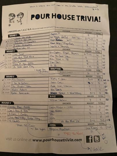 Country Music Awards was fun because "Old Crow Medicine Crow" was one of the answers and we once made that our opening category when we won trivia but weren't going to be there the following week because The Educated Friends were going to see Old Crow Medicine Show instead of playing trivia. And then I reminded Adam (the DJ) of all that and he remembered and smiled. So that was fun. The other categories were mostly fine too: Can I Have a Beer? (Yes, you may... and it'll be a Sam Adams); 3 Clues, 1 Country (Alex called "Peru" right from the get-go); Dick Vitale (whom I originally thought was Dick the Tally, like that was his codename and he kept tallies on sports teams... but Ben set me straight), and TV Quotes (Ben remembered many, many things from Game of Thrones).