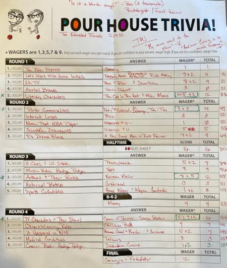 TV Characters and Their Shows was fine, as were Oscar Winning Roles, It Happened on New Year's Eve, Medical Conditions, and Comic Book Hodge Podge. A lot of times that last round can be brutal, but we nailed it on Thursday night!