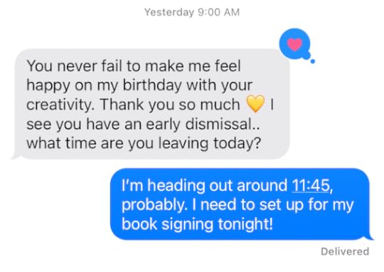 Now... that doesn't mean I don't fantasize about which one of my characters I would most like to date. I absolutely do! Take, for example, this text exchange with Mary that occurred earlier this evening: