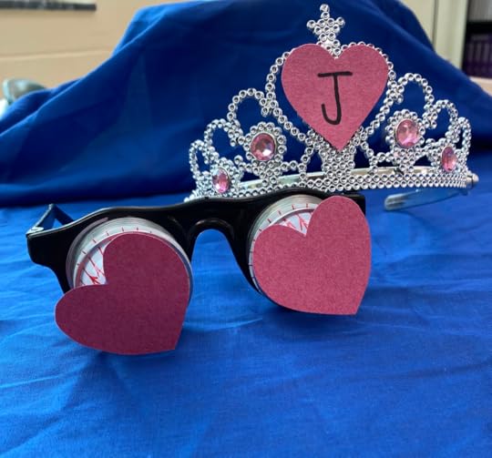 Today he portrayed Juliet, which was equally amusing. Decked out in a wig, a tiara, and heart glasses, Mr. Great-With-Accents stood on a desk (it was the balcony scene, after all) and managed a British accent in a high-pitched voice. It was wonderful!