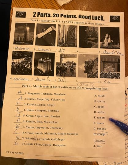 The Name's Almost the Same was figured out by Phil and Brock (one knew The Killers came from Vegas and the other knew Simon Pegg), Advertising Slogans was another win for Phil (Ben and Jerry's!), and "'F' the Sports Round" was all Brock. I mean, it wasn't all Brock since Mary and Phil figured out "falcon" and a few people knew "fade away," but Brock came up with "five hole" and he was the only one to come up with "five hole" and "five hole" was the answer so we were all proud of him. I gave him pats on the shoulder.