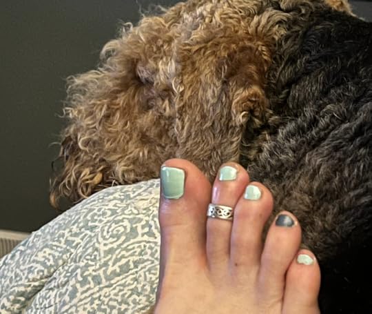 I also got new nail polish and painted my toes earlier today. Isn't this a great color scheme? It's kind of like visiting my home... only you're visiting my toes instead. But, I mean, everything in my home essentially consists of teal and grey and so my toes really match the ambience right now.