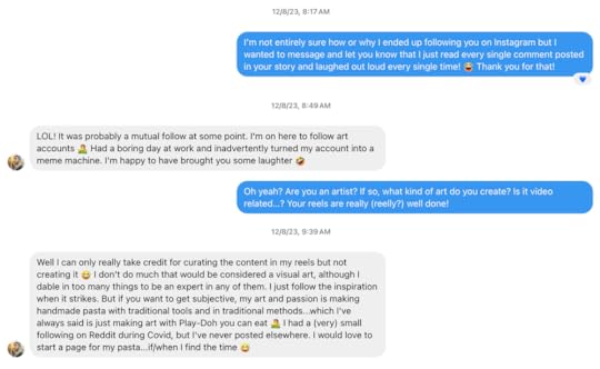 Nick and I kept talking about art. And food. And music (bluegrass). And eventually how I live in Gettysburg. Turns out, he also grew up in Adams County and his mother-in-law lives in Gettysburg... and she owns some of my chicken art... which she bought at Bantam! Nick added, "This means I'll have to bring you pasta next time we're in town... you know, as long as you can ignore all of the signals in your brain telling you not to accept food from strangers on the internet."