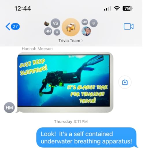 The last few times we chose the audio category as our bonus category we got burned, so this week we chose something different for round two to take the pressure off of us, which seemed like a particularly good choice when we found out it would be naming artists covering Billy Joel songs. None of them started the fire, but the team was collectively able to identify the voices of Garth Brooks, Dolly Parton , and Ariana Grande to get full points. Luckily, we did get our bonus category correct by recognizing that the Bull & Finch is the actual name of the Cheers bar (NORM!). We also knew that the first televised presidential debate was between Nixon and JFK, and even though Hannah originally thought that the name of the pink medicine that helps heal rashes was chamomile, we managed to correct that and answer calamine. (Note that they did not mention that Calamine was also a great turn-of-the-millenium band that did one of my all time favorite tv theme songs .) The final question of the round asked for the athletic activity whose name is an acronym where you have to be careful not to get the bends. Now, if you are reading closely then you know the hint of the day was a scuba diver and that is the answer. But did you also foretell that the bonus question would be to say what ‘scuba’ is an acronym for like I did?