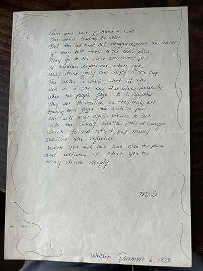 Some lessons we learn early in life. While cleaning out a file cabinet I came across a folder of old stuff, including a poem I wrote on Thursday, December 6, 1973. In my twenty short years on earth I had apparently already stumbled upon the inconvenient truth that pain and love are partners. They are a package deal, and try as we might, we simply can’t have one without the other. Not if we want the real-meal-deal.
