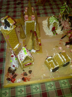 I envisioned a cute little town scene with houses made of graham crackers (I may be a Domestic Goddess, but making enough gingerbread for an entire village was beyond my call of duty I decided) decorated with frosting and hard candies. I even got ice cream cones so they could make cute little trees, animal crackers, and plenty of colorful frosting. What I got was a Jedi Temple where Anakin killed all the younglings, a car that ran over and squished (with lots of red frosting) an animal cracker, and an animal cracker massacre. Yes, I do have boys. So much for my sweet little festive Christmas village.