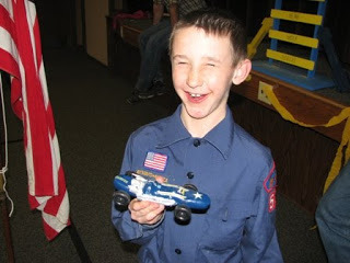 He won first place for the entire Pinewood Derby. His car is super cool and he was very happy--all that work paid off.