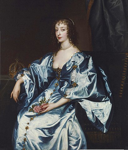 Images: Charles I and Henrietta Maria with their two eldest children, Prince Charles and Princess Mary, by Sir Anthony Van Dyck, 1631-32, RCIN 405353, Royal Collection Trust / © Her Majesty Queen Elizabeth II 2018. Charles I, Henrietta Maria and Charles, Prince of Wales (later Charles II), by Hendrik Gerritsz Pot, c.1632, RCIN 405541, Royal Collection Trust / © Her Majesty Queen Elizabeth II 2018. Portrait of Charles I and Queen Henrietta Maria, by Anthony van Dyck, 1632, Kroměříž Castle, via Wikimedia Commons. Princess Henrietta Maria of France, Queen consort of England, by Anthony van Dyck, c.1636-1638, San Diego Museum of Art, via Wikimedia Commons.