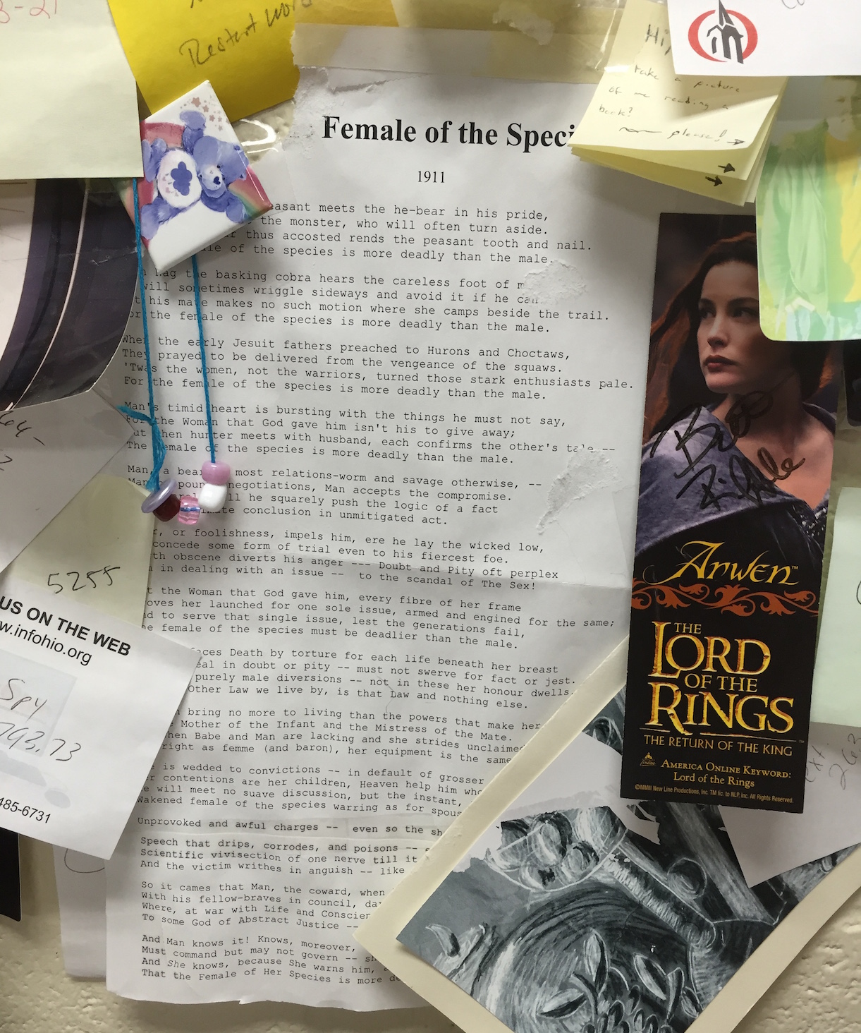 At the time I didn't know if I would be able to work forty a week and still write, but I wanted to. When I moved into my new office I printed out a copy of the Rudyard Kipling poem "The Female Of The Species," from which I'd taken the title of my first novel, and hung it on the wall facing my desk. It was a reminder to persevere, that even though work was done at three I might not be, and that there was something more I wanted to do with my life.