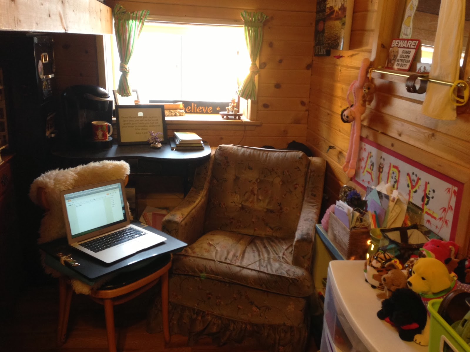 This (below) was my writing corner from November 2012 until June of 2014 when my family moved. Hundreds of blog posts came to life in this cozy nook. In fact, if you look closely at the computer you can see I was drafting a post on it.