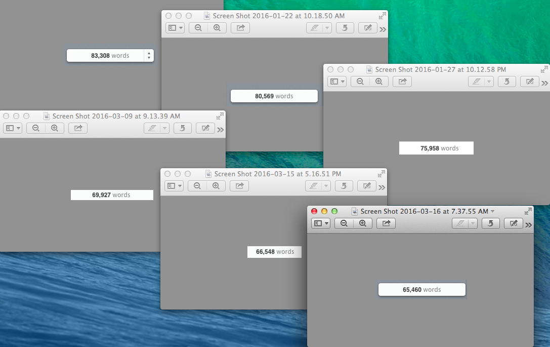 My editing is crawling along. It's not at a stand still though, so that's a plus. I've been taking screenshots of my upward (downward?) progression regarding word count to help me keep track of how many words I'm deleting and how many scenes I'm removing.