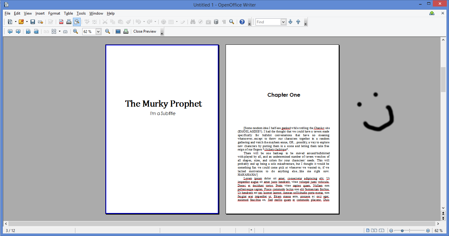 IMPORTANT NOTE: Sometimes OpenOffice will try to force a ghost page on you and no matter what you do, your numbering will be off for no apparent reason. The ghost page only appears on the "Page View" option (what I've circled below). Seriously? The fuck is this shit? It counts the ghost page as 1, which throws off every page thereafter. No bueno.