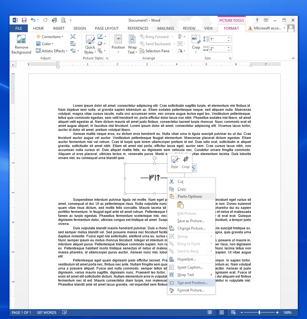 You may end up playing with the size ratio a bit to get the image to look right when situated with the text. I deleted the blank line above and below where I inserted it, as well. To get the dialogue options, right click on the photo and go to "Size and Positioning."