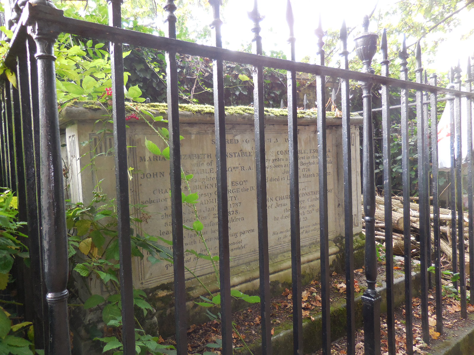 Inscriptions on the tomb read :"Sacred to the Memory of Maria Elizabeth Constable, wife of John Constable, Esq. RA, daughter of Charles Bicknell, Esq. solicitor to His Majesty King George IV and to the Admiralty; born Jan. 15, 1787 died November 23, 1828, leaving seven infant children to lament her loss in common with their surviving parent. John Constable, Esq., RA, many years resident in this parish, he was born at East Bergholt in Suffolk June 11, 1776 and died in London March 31, 1837. Also of John Charles Constable, Esq. of Jesus College, Cambridge, their eldest son, he died March 30, 1841, aged 23. His mortal remains are interred in the chapel of his college. Also of Charles Golding Constable, 1821-1878 of the British East India navy."