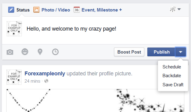 To create a post that'll publish on a future date, click in the box that's ghosted Write Something... and type in what you want to share. DON'T CLICK PUBLISH. Instead, click the arrow next to publish and get the dropdown menu. Looks like this: