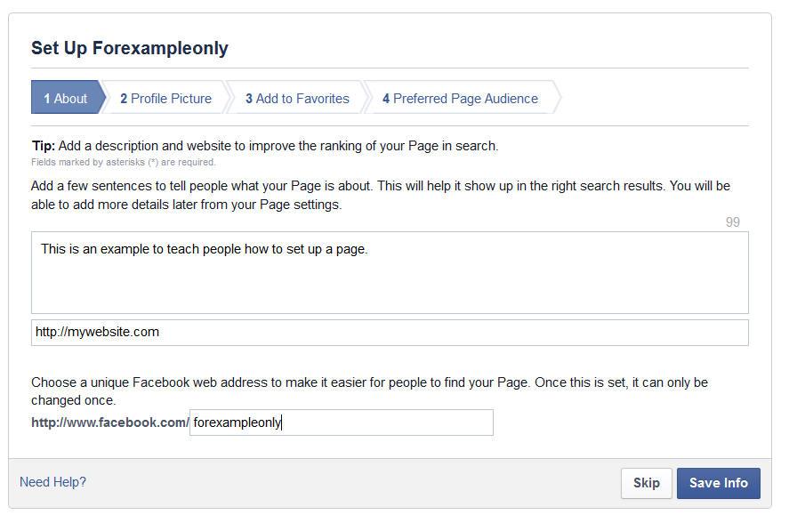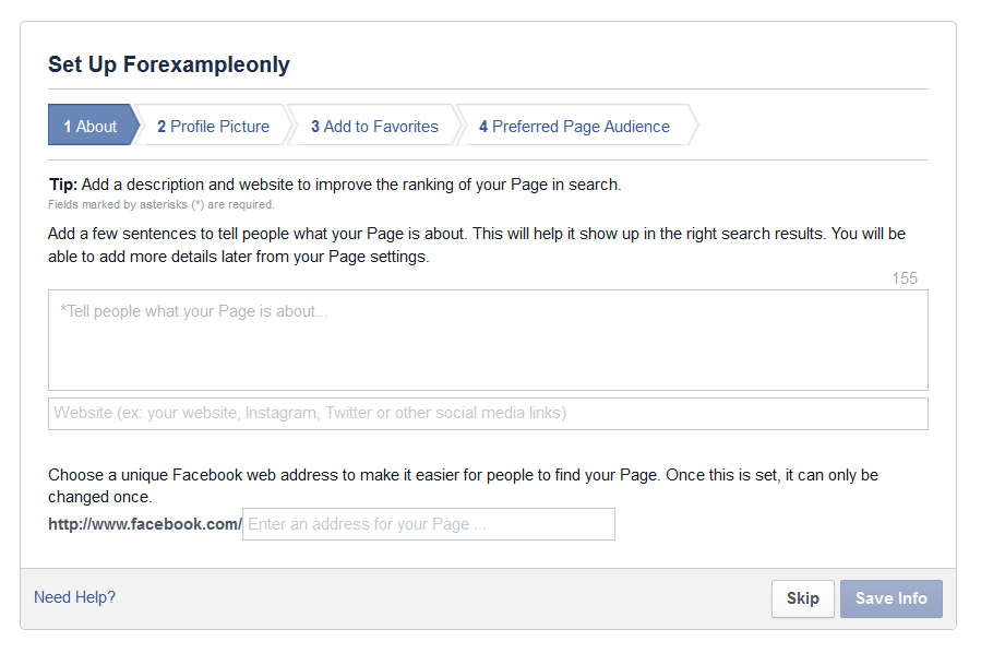 This first tab is the basic stuff you'd expect. You add a description of what your page is about (don't use your author bio, please) in about 200 characters, and what fans can expect to find there. Add your website address, too.