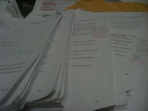 It was the messy, marked-up EYE OF THE STORM manuscipt! I shared a couple pages with them before we all went to eat lunch.