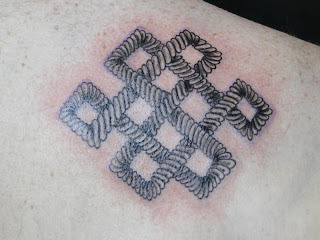 I decided to go with the endless knot as my tattoo. Years ago, my good friend Chuck gave me a couple of bone china tea cups that featured a Celtic endless knot. And in my recent readings of Buddhist texts, the endless knot has appeared there as well. Many interpretations of the endless know exist, but my preliminary choice of it was that it represents both everything and nothing. You can think of it this way: