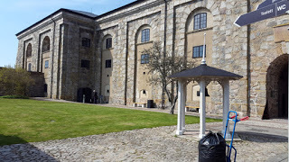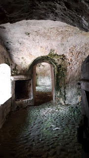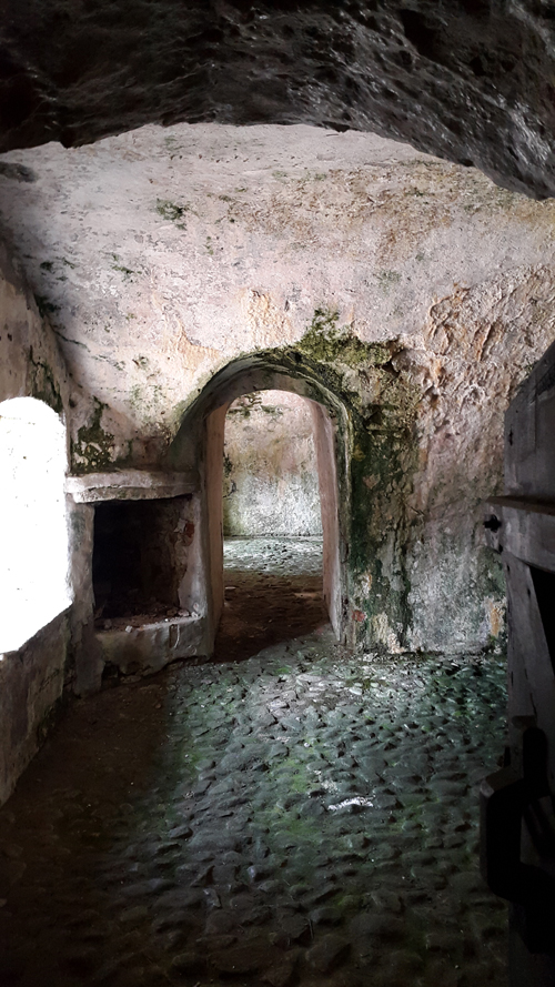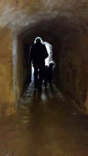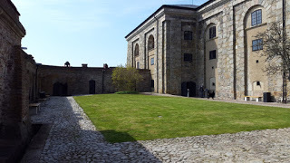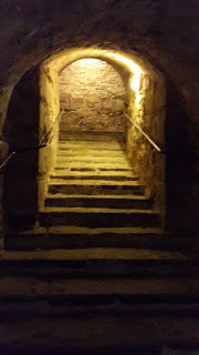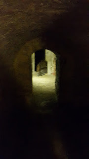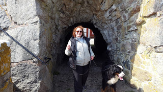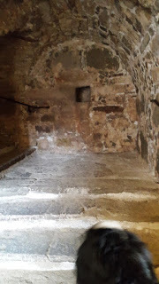 Min fantasi väcktes när jag vandrade omkring i kastellet. Jag blev lika skrivsugen här som jag brukar bli på Kalmar slott . Här kommer Tudor och jag ut genom en av gångarna.