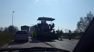 På vägen in till staden blev vi fördröjda av asfalteringsarbete. Det luktade sommar när vi satt med nedvevade fönster.