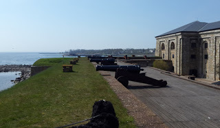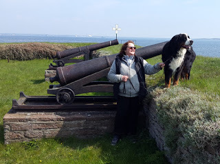 Kanonerna var helt nymålade och glänste svarta när vi gick uppe på krönet. Jag höll hårt i Tudors koppel, eftersom han nyfiket kikade ned i vattnet långt, långt där nedanför.