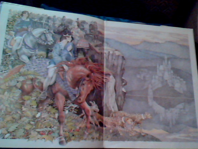 Frankly, I was obsessed with it. It followed me everywhere. I used to use it to lean on when I was drawing (and before I discovered the joys of writing, I drew CONSTANTLY). I stored my completed pictures - maps of fantasy countries and princesses and castles - between the pages. That book, with its curled over plastic cover, its shiny pages and purple end papers, and it's magnificent illustrations, became so much a part of me that I suppose it seeped indelibly into my imagination's landscape.
