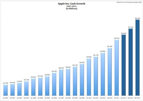 Fortune's Andy Zaky argues that when you keep this in mind that means that Apple's share prices reflect an irrationally low estimate of its "enterprise value." An alternative interpretation is that they reflect a market assumption that this cash will eventually be wasted.