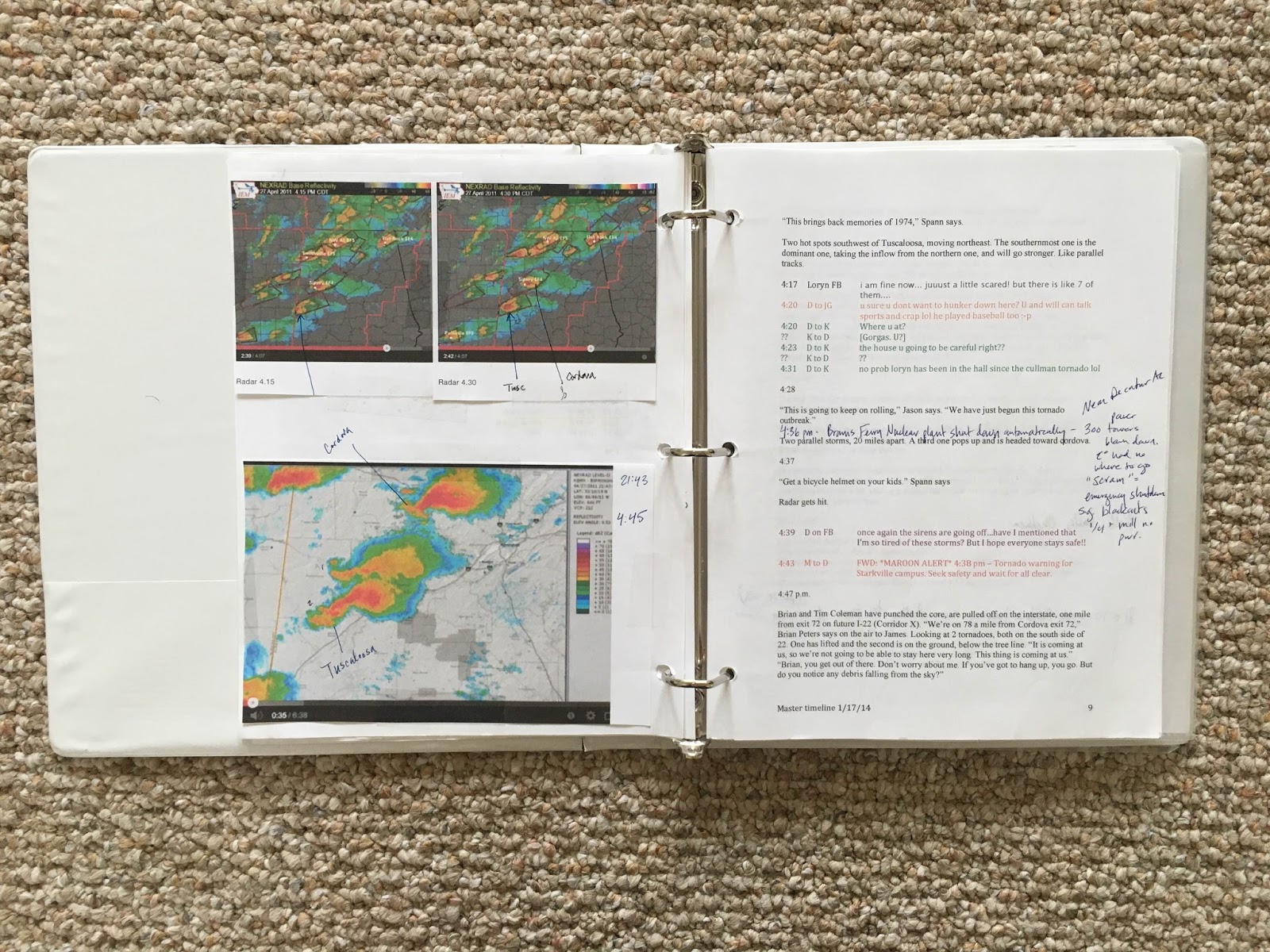 By the way, the paperback edition of Kim’s book has a new subtitle: A True Story of Love and Resilience in the Worst Superstorm in History. And here’s a sample of the elaborate timeline she created to help tie the storm’s moment-by-moment progress to her narrative.